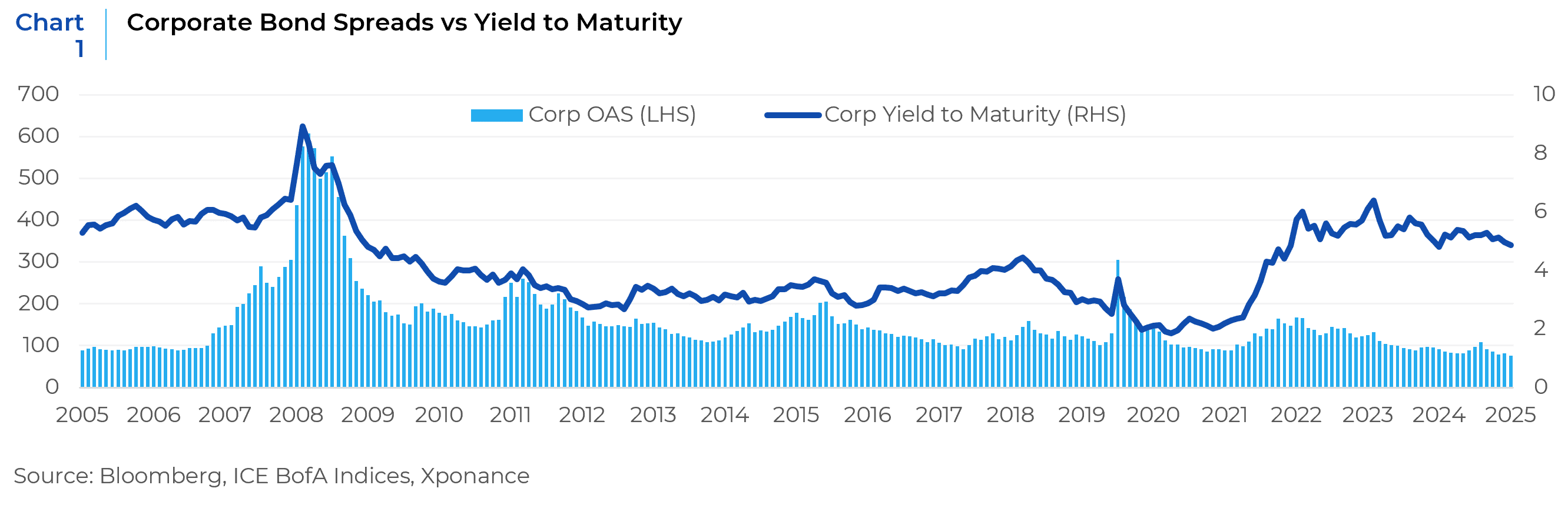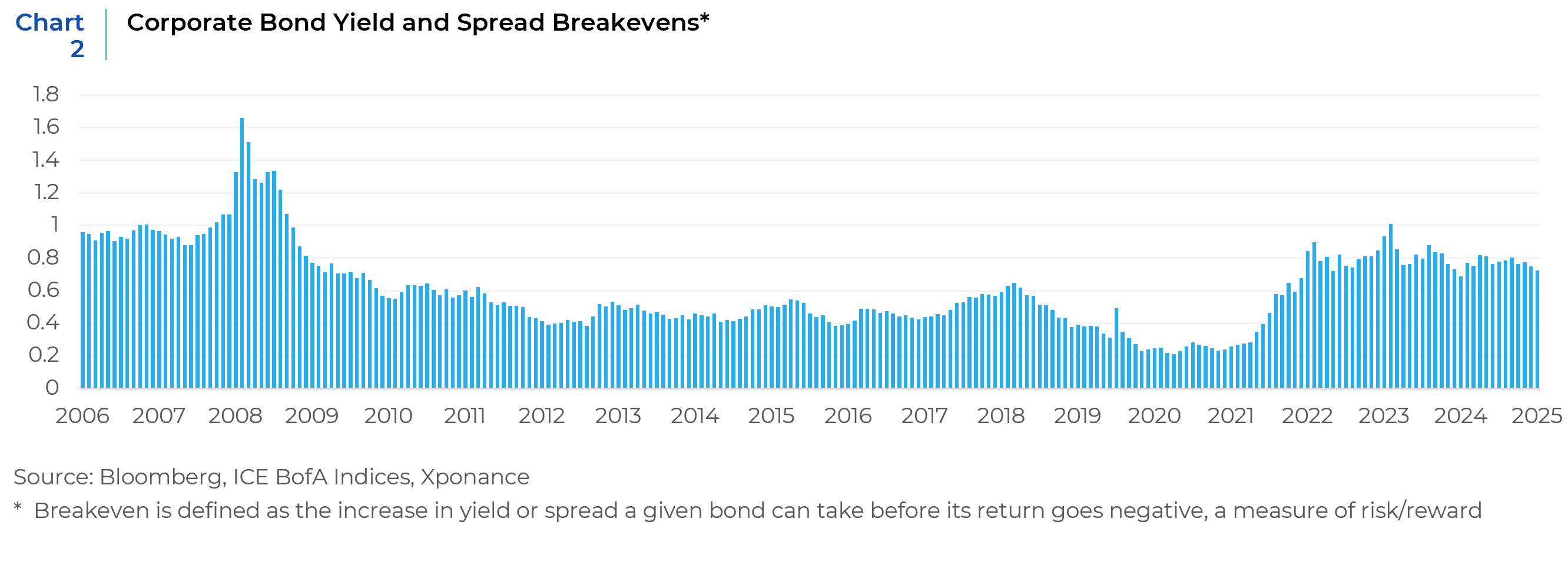 Fixed income valuation encompasses more than just risk premia—it also involves all-in yields, the term structure of credit spreads, and relative valuation across sectors and rating levels. The tightness of spreads, in our view, reflects a broader disconnect among financial market indices (both fixed income and equity) that are not necessarily representative of the underlying economy.
