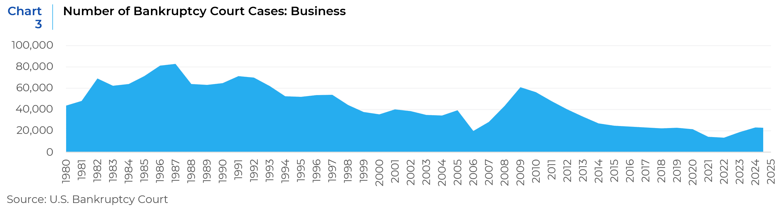 To better understand current business dynamics, we moved beyond anecdotal evidence—such as news stories—and examined small business data directly. While defaults among large-cap bond issuers remain relatively muted by historical standards, the nature of those defaults has shifted, with distressed exchanges now comprising a larger share of the total. A distressed exchange is a restructuring strategy where a company that is in financial distress offers new debt or equity securities to its existing creditors in exchange for their current debt. This “out-of-court” negotiation is used to avoid bankruptcy while still reducing overall leverage, extending debt maturities, and easing debt service burdens, though often requiring creditors to take a financial loss. This form of restructuring is not typically available to smaller companies.