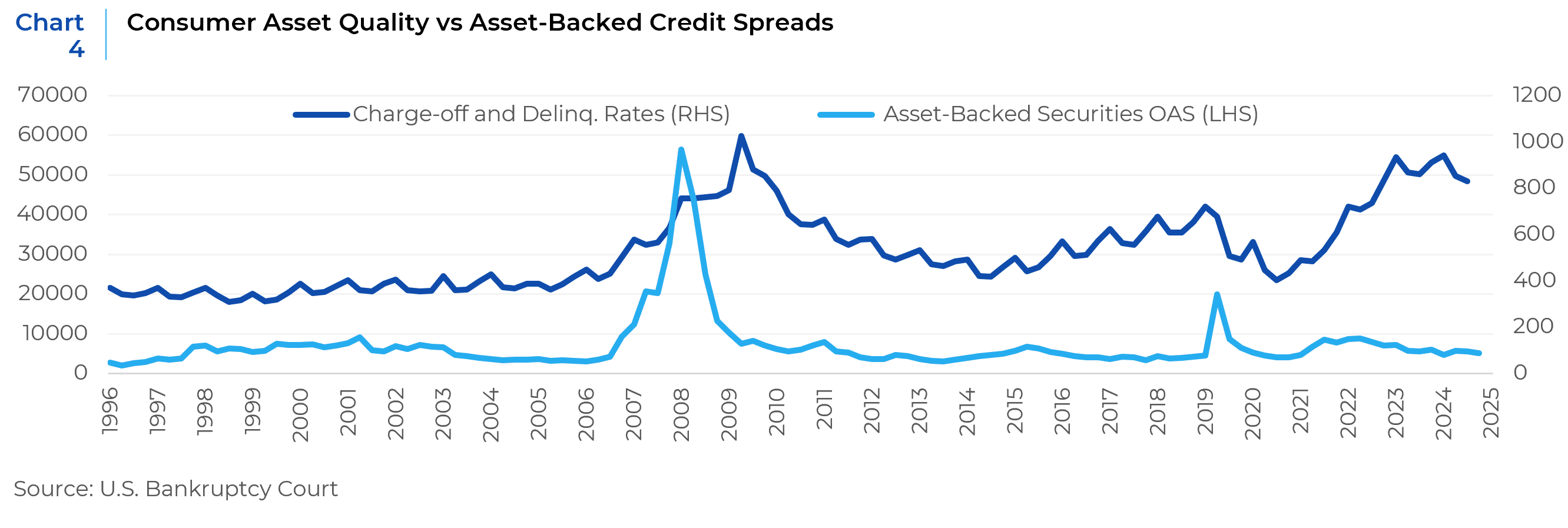 To better understand bottom-up trends in consumer credit quality, we examined Federal Reserve banking data on consumer delinquencies and their potential impact on asset securitization markets. Several consumer lending categories are now experiencing delinquency rates comparable only to those seen during the Global Financial Crisis (GFC). Despite this deterioration, spreads in the Asset-Backed Securities (ABS) market have remained relatively stable, though dispersion is evident across its underlying sub-sectors.