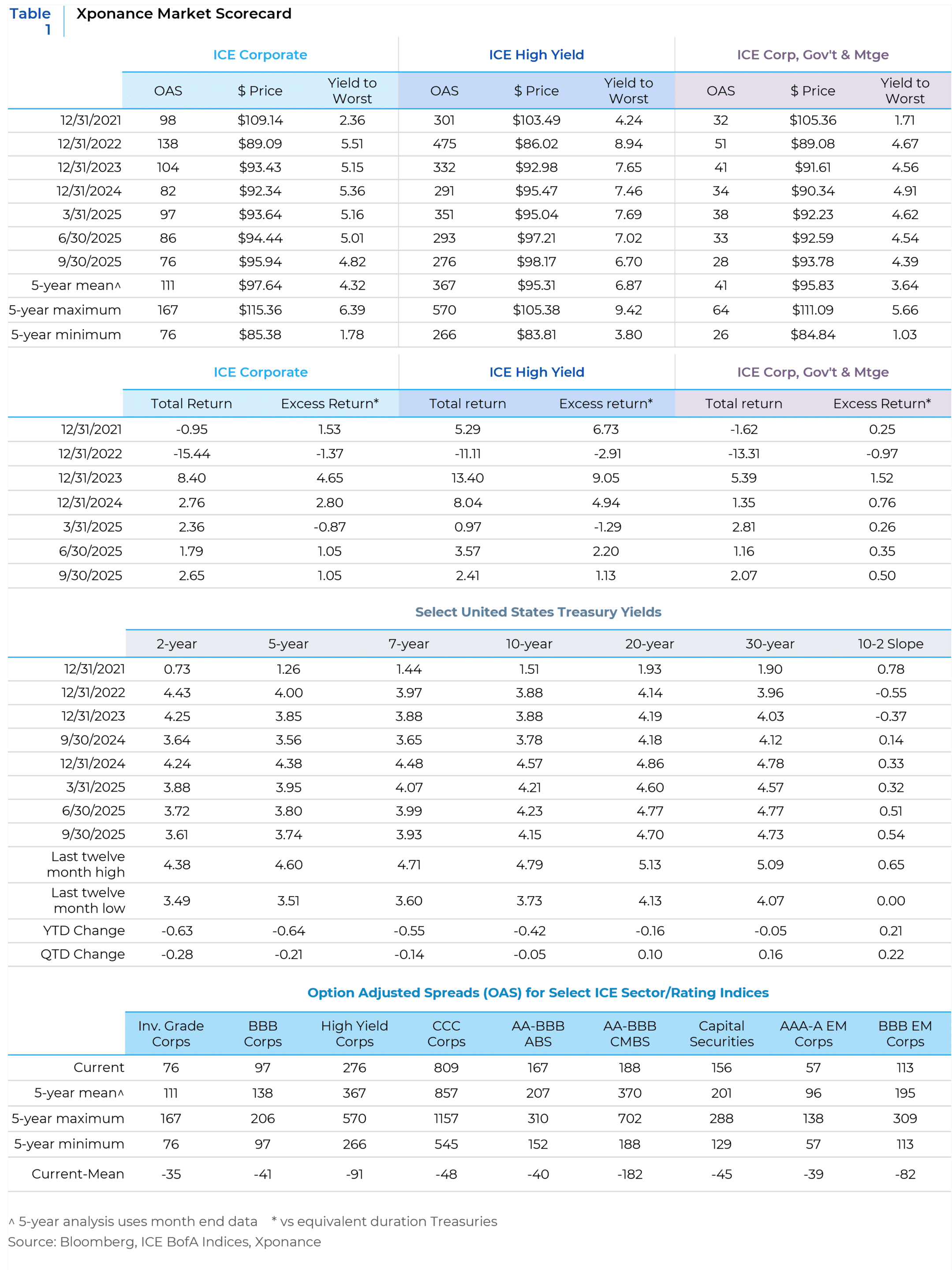 As we enter the home stretch of 2025, we are struck by the current state of valuations in the fixed income markets. To be sure, total returns in fixed income have been strongly positive year-to-date, despite mounting economic headwinds. We’re frequently asked why fixed income spreads remain so tight in this environment. From a pure valuation perspective, we offer the following explanation.