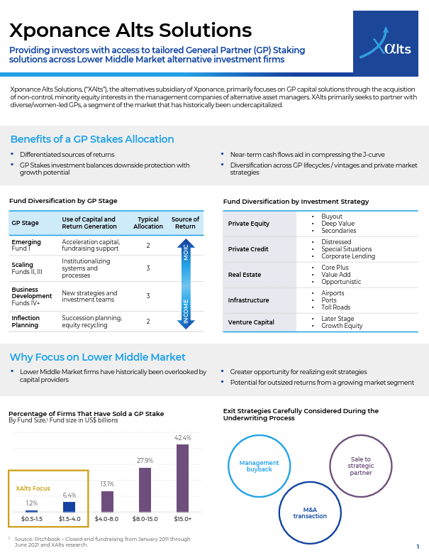 Xponance Alts, LLC is a subsidiary of Xponance, Inc., that will extend Xponance’s long track record of sourcing, supporting and seeding Diverse & Emerging Managers to the private markets. XAlts seeks to partner with GPs that manage alternative asset strategies across private equity, private credit, real estate, and infrastructure.