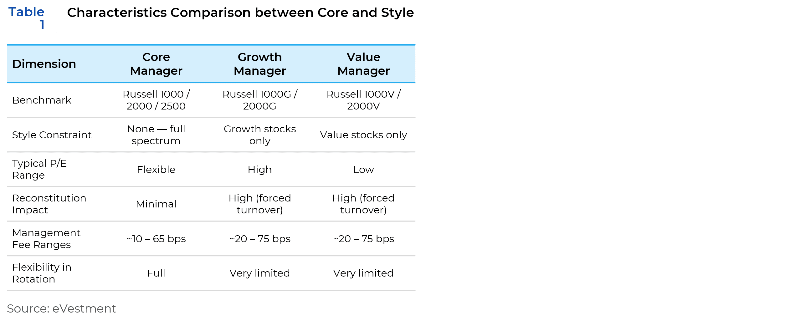 Table 1 highlights these practical differences. Core managers are typically benchmarked against broad indices such as the Russell 1000 or 2000 without a style constraint, allowing greater flexibility in portfolio rotation and access to the full range of valuation multiples. In contrast, growth and value managers operate within style-specific benchmarks and are more exposed to reconstitution effects, which can lead to higher levels of forced turnover. Core strategies also tend to have lower institutional fees than style-focused approaches.