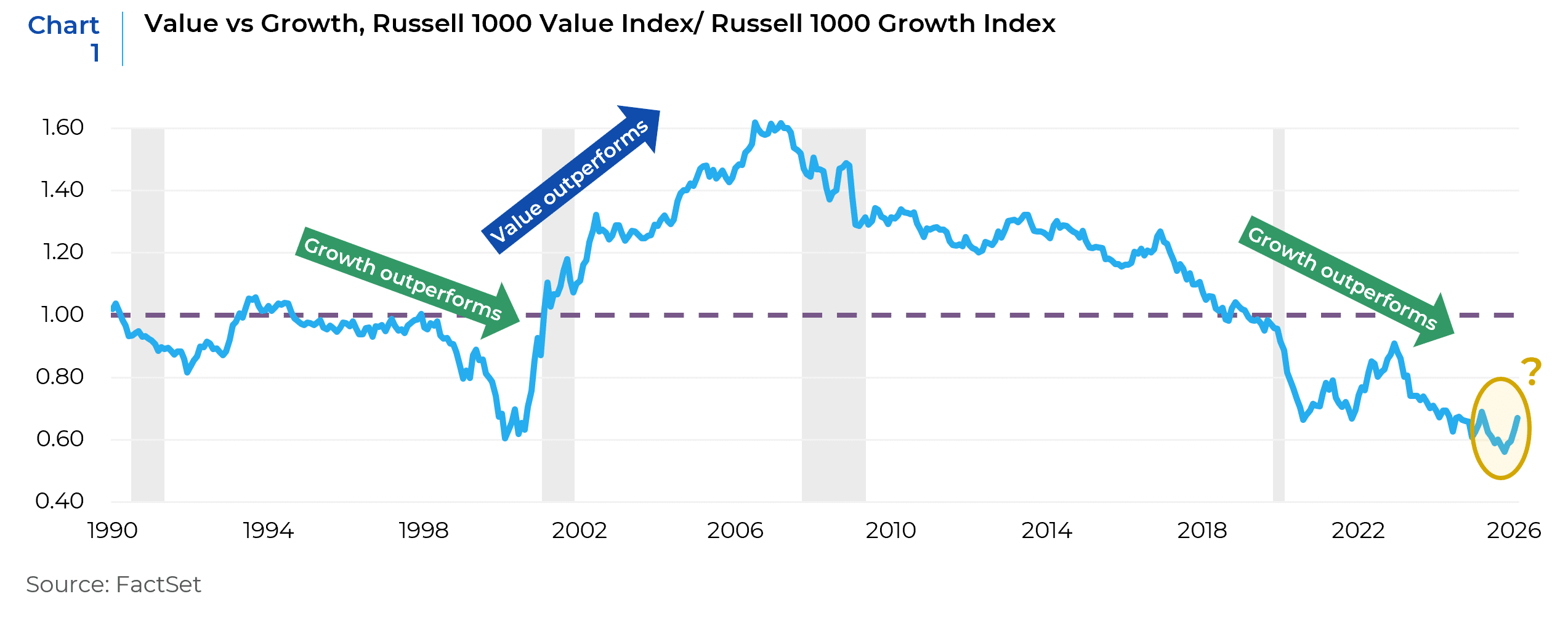 While style investing may capture factor premia over long horizons, it also introduces structural risks tied to shifts in market leadership. Performance leadership between value and growth rotates over time in response to macroeconomic conditions, interest-rate cycles, technological innovation, and changing investor expectations. Growth stocks, for example, dominated during the technology-driven expansion of the 2010s, while value has historically performed better in periods of economic recovery or rising inflation. As seen in Chart 1, periods of value outperformance are often followed by growth leadership, and vice versa, underscoring the cyclical nature of style returns.