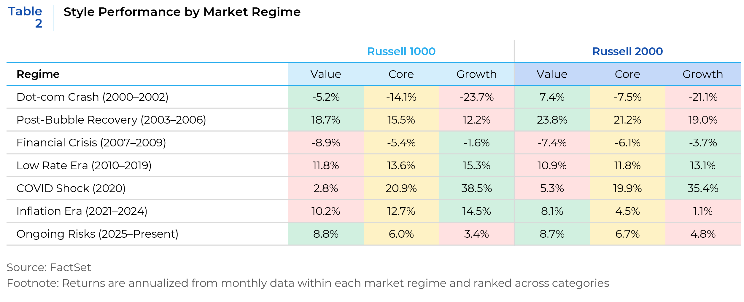 The regime-based analysis in Table 2 underscores the cyclical nature of style leadership across different macroeconomic environments. Periods of growth outperformance have typically coincided with low interest rates, innovation-driven environments, while value has tended to perform better during inflationary periods and the early stages of economic recovery. However, these shifts in leadership are difficult to anticipate in real time and can persist for extended periods before reversing. As a result, investors with concentrated exposure to a single style may experience prolonged periods of relative underperformance when leadership changes. By contrast, core strategies maintain continuous exposure across styles, reducing reliance on correctly anticipating shifts in market leadership. This balanced approach helps mitigate the impact of style cycles and supports more consistent performance across varying market environments.