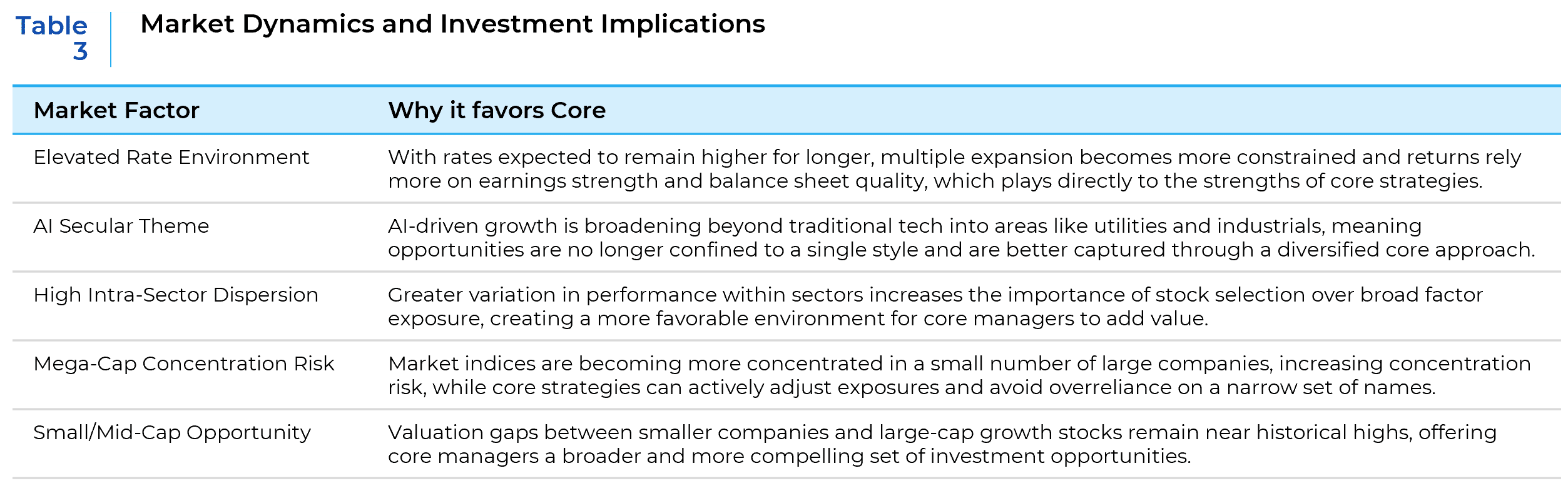 As of the first quarter of 2026, as highlighted in Table 3, several structural factors are aligning to favor core mandates over traditional style-based allocations. AI driven growth is increasingly broadening beyond traditional technology sectors into areas such as utilities and industrials, expanding the opportunity set across the market. At the same time, greater variation in performance within sectors is increasing the importance of stock selection over broad factor exposure. This is occurring alongside rising concentration in a small number of mega cap companies, as well as attractive opportunities emerging across small and mid-cap segments. In this environment, the managers best positioned to capture the full opportunity set are those able to allocate flexibly across styles, combining durable growth franchises with attractively valued cyclical businesses within a single portfolio.