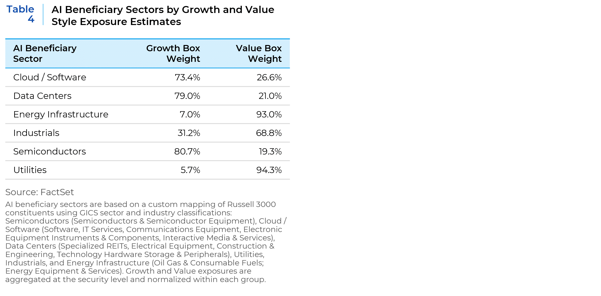 The AI-driven capital expenditure cycle serves as a particularly clear illustration of these dynamics in practice. Table 4 shows a sector-based decomposition of AI-related beneficiaries, where growth and value exposures are aggregated and normalized within each category to assess style composition. Segments such as Cloud and Software, Data Centers, and Semiconductors remain predominantly growth oriented, while Energy Infrastructure, Utilities, and Industrials exhibit a stronger value tilt. This dispersion across AI-linked segments highlights that leadership within the ecosystem is not confined to a single style and can shift as different parts of the value chain drive returns. As a result, style-constrained managers are inherently limited in their ability to capture the full opportunity set, whereas a core blend approach offers a structural advantage by providing consistent and comprehensive exposure to both growth and value beneficiaries of the AI cycle.
