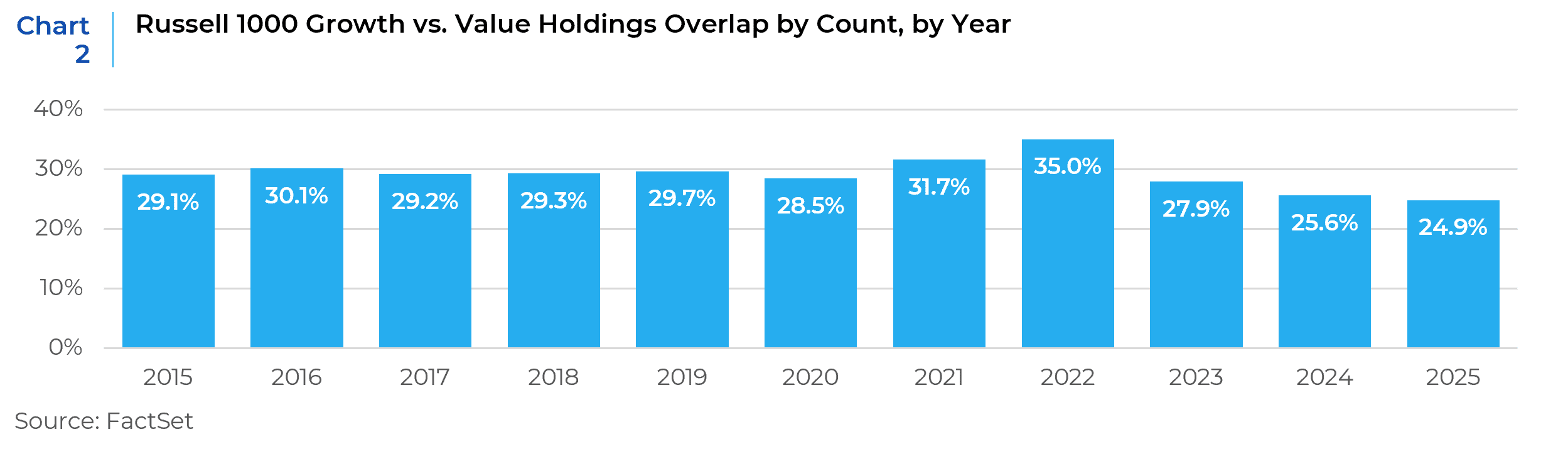 Importantly, style exposures are not as distinct as they are often assumed to be. While growth and value are typically treated as separate and complementary allocations, in practice there is a meaningful and persistent overlap in holdings between the Russell 1000 Growth and Russell 1000 Value indices. As illustrated in Chart 2 below, this overlap has consistently ranged between 25% and 35% over the past decade.