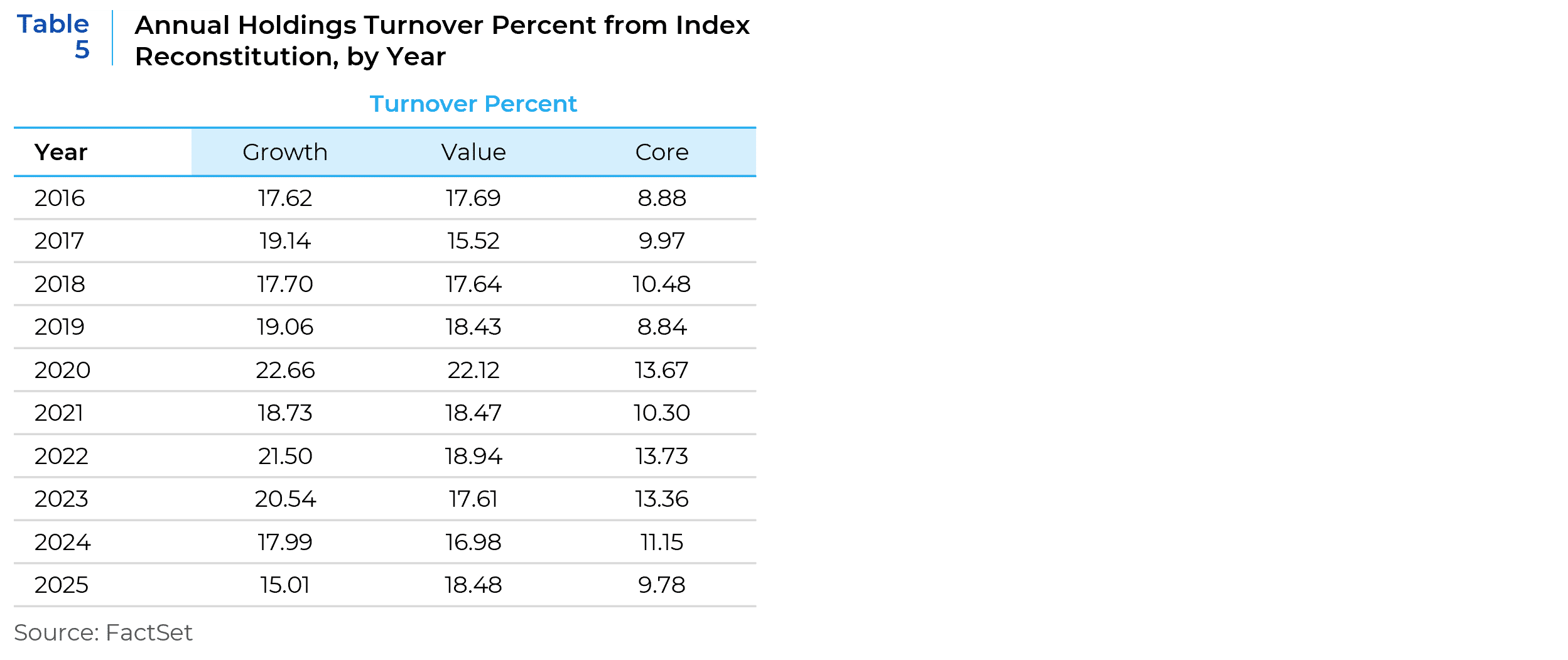 As shown in Table 5, turnover in both the growth and value indices has generally remained higher than in the core index. This difference has practical implications for portfolio construction, especially for managers that attempt to minimize tracking error relative to their style benchmark. Allocating across separate growth and value managers can lead to higher aggregate trading activity, as each strategy adjusts to classification changes. In contrast, a core manager, benchmarked to the full index, tends to experience less rebalancing-related turnover. Therefore, a core approach may offer a more efficient implementation, with lower turnover and potentially reduced transaction costs, while still providing broad market exposure