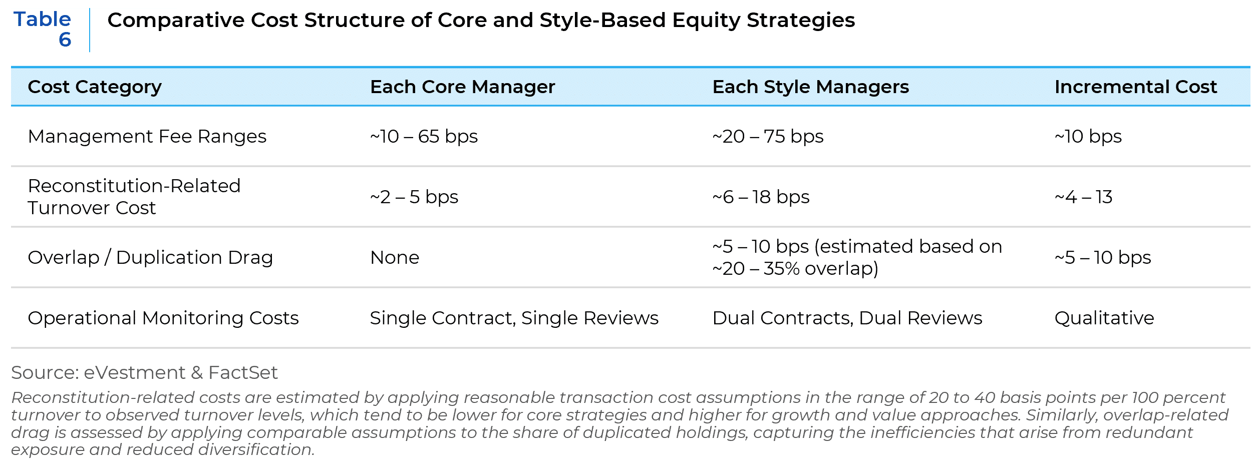 These differences in turnover represent only one dimension of the broader cost considerations associated with style-based allocations. While style-based allocations are often justified on diversification grounds, they can introduce multiple layers of cost that are not always immediately apparent. Table 6 provides a more detailed view of these cost components. Managing separate growth and value mandates also adds operational complexity, requiring additional oversight, coordination, and ongoing monitoring. Over time, these frictions can accumulate and weigh on performance, making style-based approaches less cost-efficient than they may initially appear. By contrast, adding a core strategy can deliver comparable market exposure through a more streamlined and efficient structure.