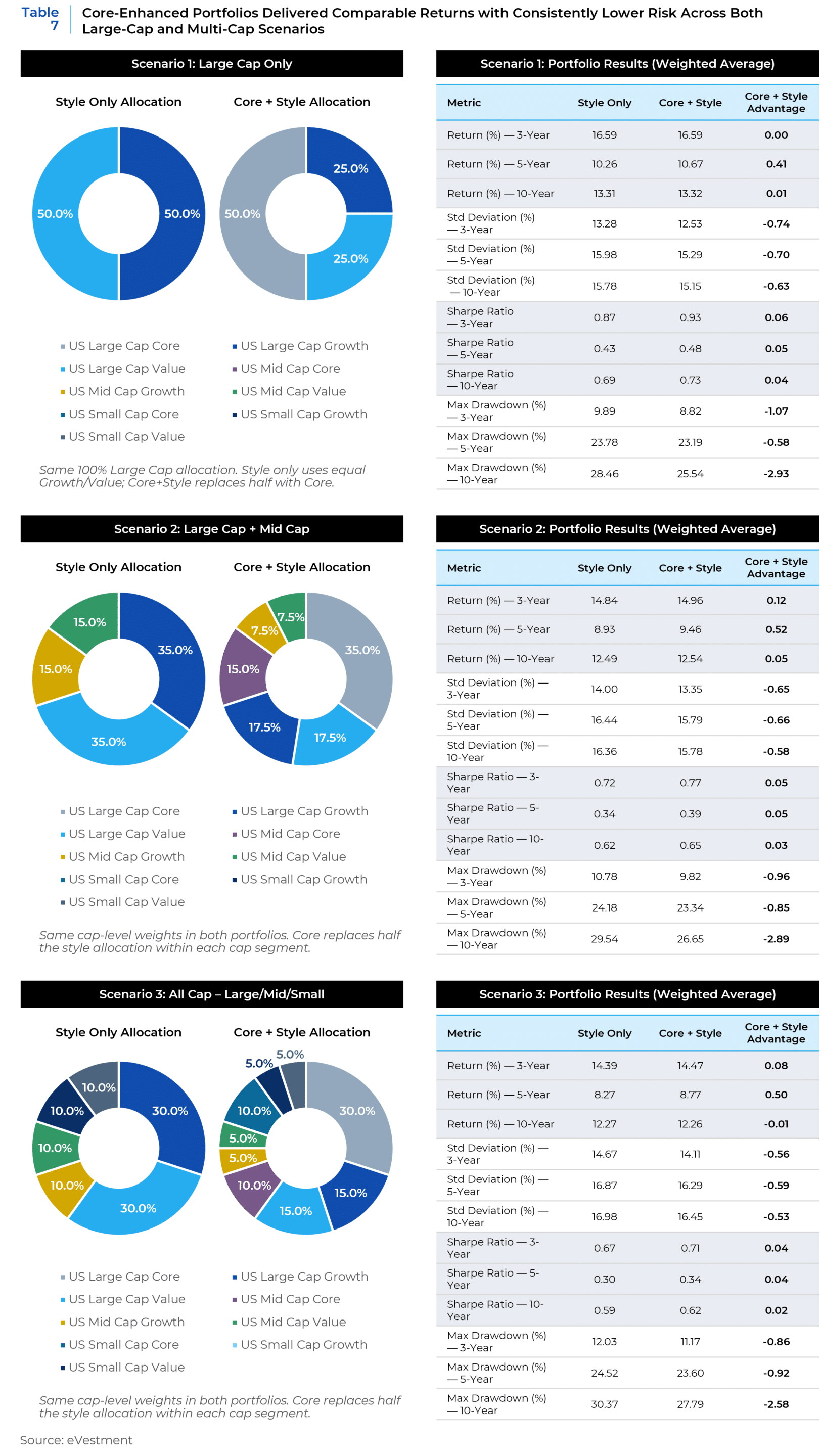 As summarized in Table 7, in the large-cap scenario, replacing a portion of the growth and value allocation with core results in comparable returns, while meaningfully reducing volatility and drawdowns. Sharpe ratios improve modestly, reflecting more efficient return generation per unit of risk. Extending the analysis to include mid-cap exposure reinforces this pattern. In the large-cap plus mid-cap framework, introducing core within each segment leads to slightly higher returns over longer horizons, accompanied by lower standard deviation and improved drawdown profiles. The incremental Sharpe ratio improvement suggests enhanced risk-adjusted performance, indicating that core allocations contribute to more efficient diversification across market capitalizations. A similar pattern emerges in the multi-cap framework, where introducing core across large, mid, and small-cap segments leads to small improvements in returns, lower standard deviation, and better downside protection. These results indicate that core allocations can enhance portfolio efficiency without sacrificing market exposure.