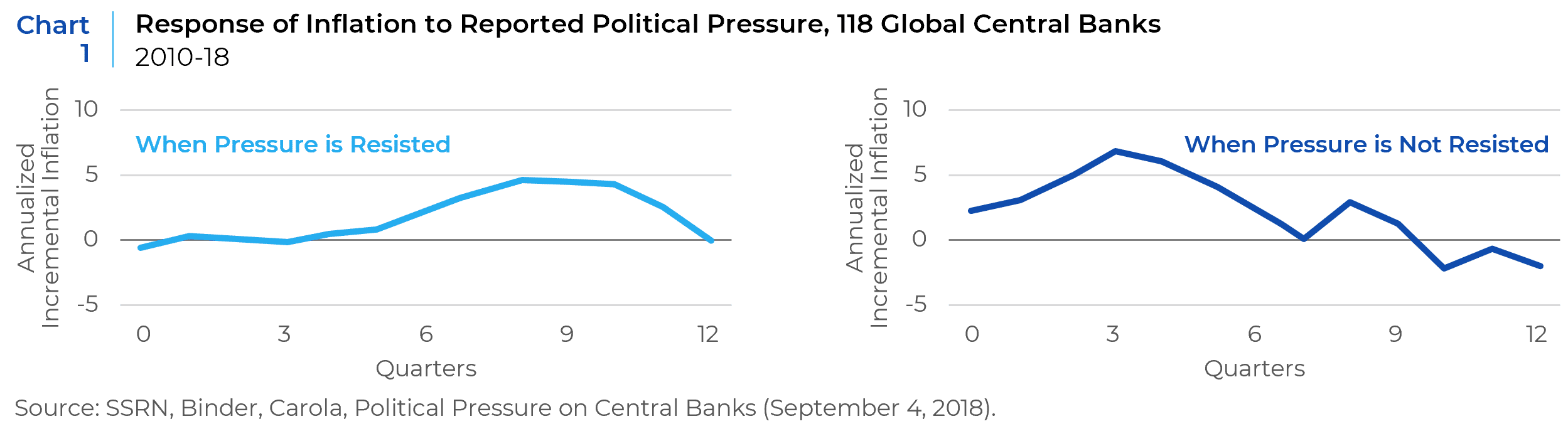 Unsurprisingly, the pressure is almost always for easier monetary policy. Holding constant prior inflationary trends, GDP growth, and other relevant factors, this research finds that political pressure on average produces material rises in future inflation, but with different lags depending on the levels of perceived resistance. As shown in Chart 1, when there is resistance to political pressure, inflationary effects are lagged, peaking two years after the initial political pressure was reported. If the central bank is reported to succumb to pressure, the above-trend inflationary effects are more immediate, but still persist for about two years on average. The lagged effect may be due to eroding central bank credibility, which only manifests itself in the data after a few quarters, on average. This research would suggest that if President Trump’s interventions in Fed policy in mid-2025 can be judged to have been resisted, then we should expect to see the impacts on inflation starting in mid-2026.
