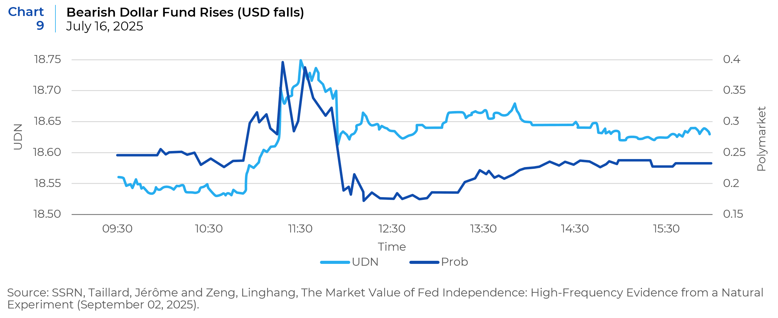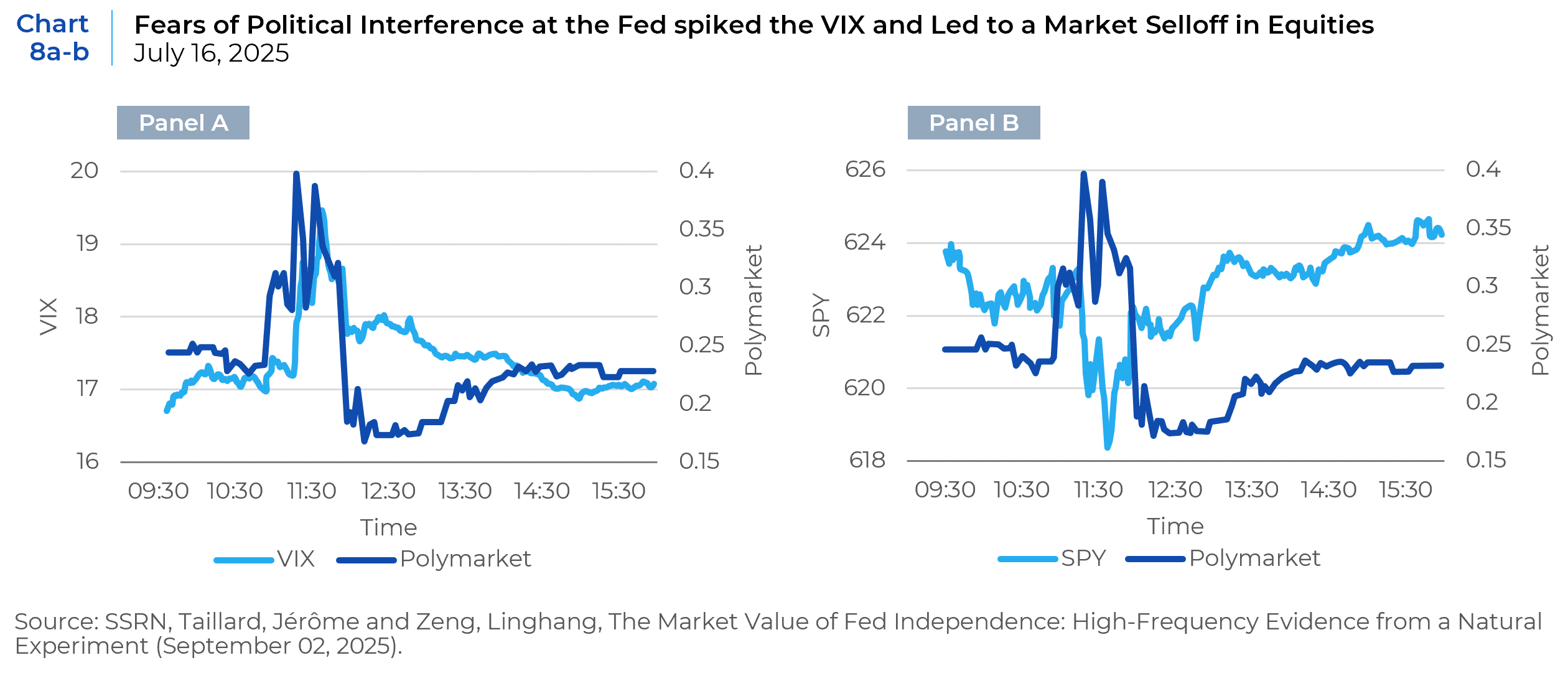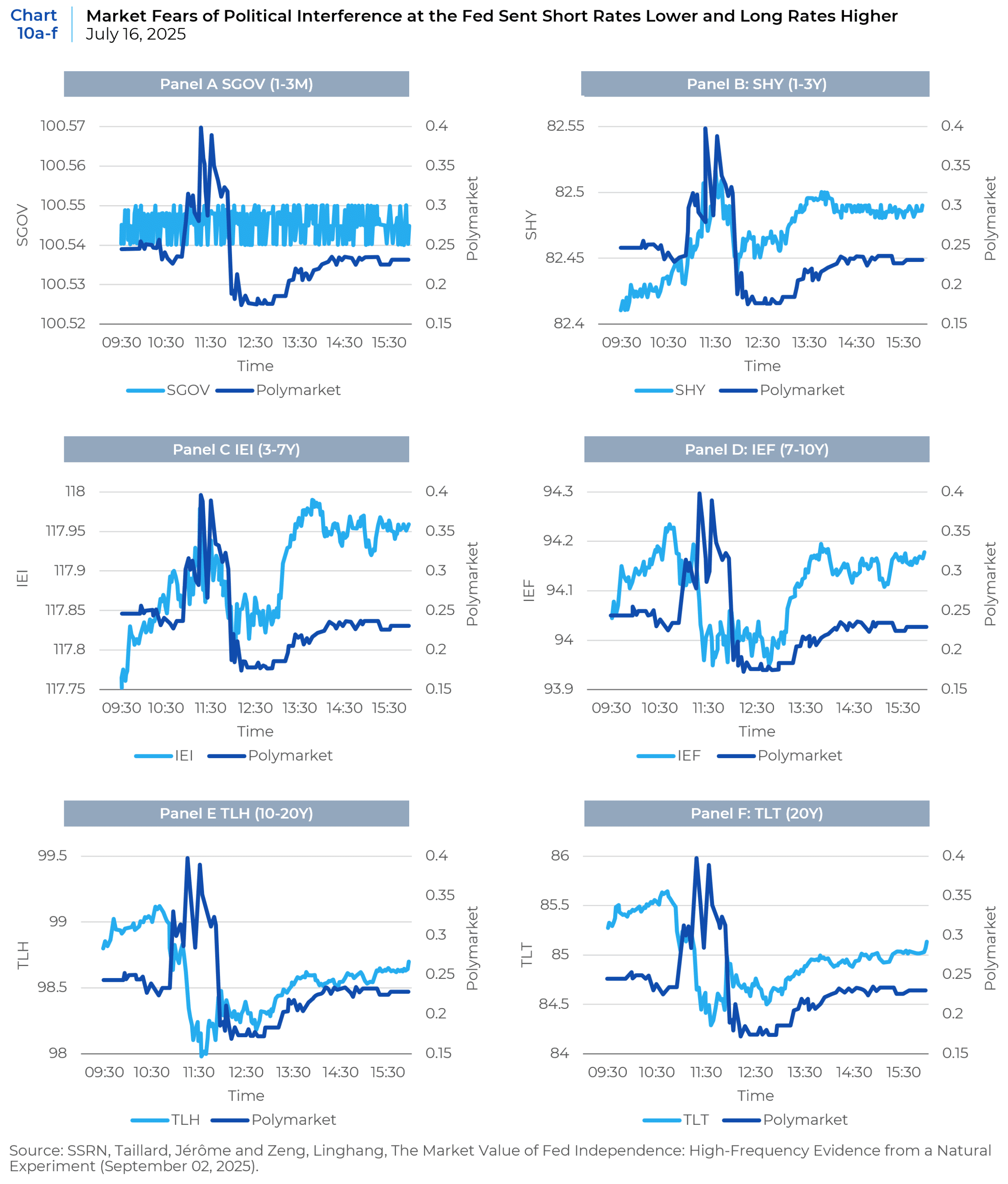 In case the previous empirical analyses remain unpersuasive, we offer even more timely research from the summer of 2025. Making use of the advent of liquid prediction markets on the platforms Polymarket and Kalshi, as well as the abundance of intra-day traded ETFs across various asset classes and maturities, economists were able to look at tick-by-tick market-created probabilities of Jerome Powell being fired by President Trump on July 16, 2025, and their impact on real-time asset price dislocations. The following charts show minute-by-minute changes in market estimated probabilities of whether Federal Reserve Chair Jerome Powell will leave office before the end of 2025 as measured by observable Polymarket contracts1 (“Polymarket” right axis) with the VIX, SPY, USD FX, and various maturities of Treasuries (see Charts 8a–8b, Chart 9 and Charts 10a–10f).