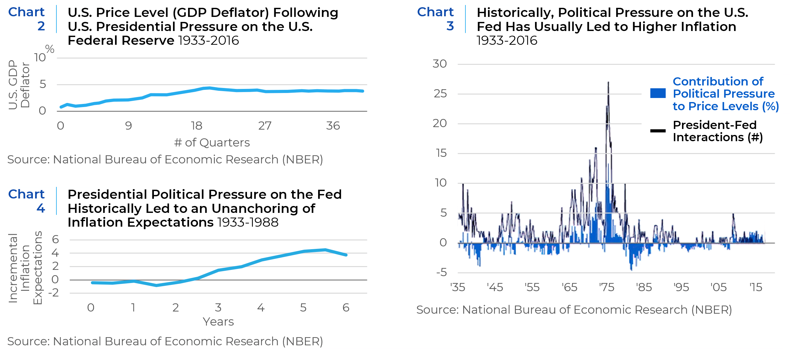 A 2024 paper from the National Bureau of Economic Research (NBER) studied the relationship of personal interactions between the sitting U.S. President and the Fed Chair or any governors from 1933 to 2016 and the correlation of those interactions with future, above trend inflation. As with the paper on political pressure across global central banks, the longitudinal study on the U.S. also demonstrates that the political pressure “response function” tends to persist for about two years. Similarly, the responses to real GDP and fiscal variables are not distinguishable from zero, but the inflationary shock is material. The study found that the price level response was more immediate but then continued to build persistently to a 5% higher price level after 4 years (see Chart 2). But it also measured the effect over time, especially following the Nixon-Burns era (see Chart 3). Most relevant for the present day, they estimate that “exerting political pressure 50% as much as Nixon did, over a period of six months, permanently increases the U.S. price level by more than 8% after several years.”