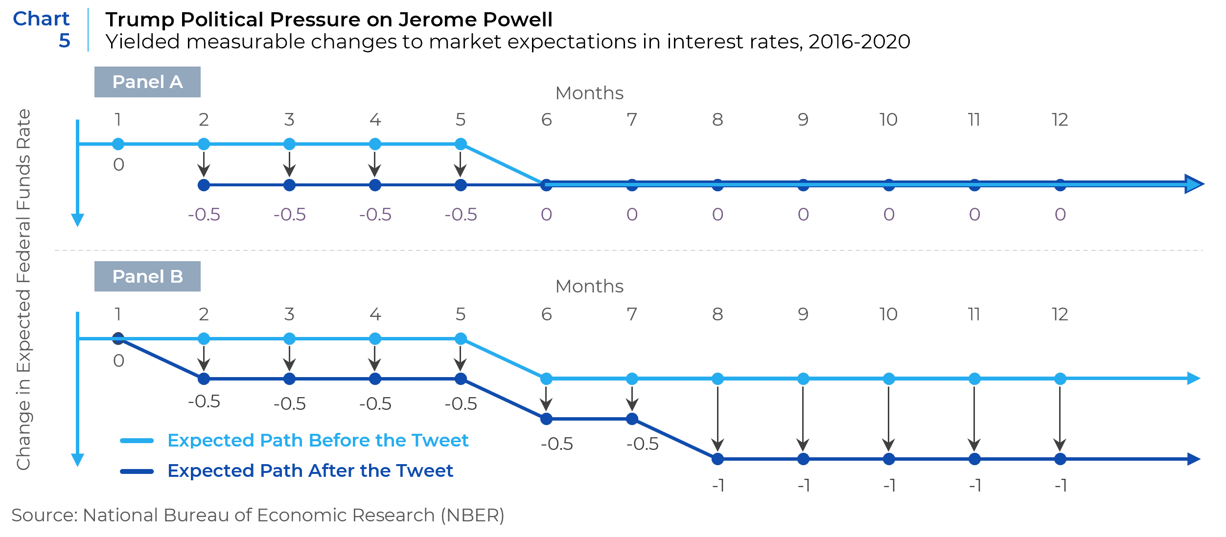 “Suppose that right before the tweet markets expect that the Fed will cut rates in six months, but not in the near future. If a tweet only induces a change in expectations about the timing of the already anticipated interest rate cut, a revision in expectations would be observed at only short horizons [see the top panel in Chart 5]. Our estimates documenting that the revision in expectations increases with the time horizon indicate that the revision in expectations is more pervasive. Markets are not sure if the Fed will succumb to political pressure in the immediate future (e.g., during the next FOMC meeting), but they assign an increasing probability of this outcome occurring at some point in the future. Suppose that, as in the previous case, before the tweet, markets expect that the Fed will cut interest rates in six months. If now the tweet generates a decline in expectations both at short and long horizons, we can infer that the tweet does not merely change the timing of an already anticipated decline (see the bottom panel in Chart 5).”