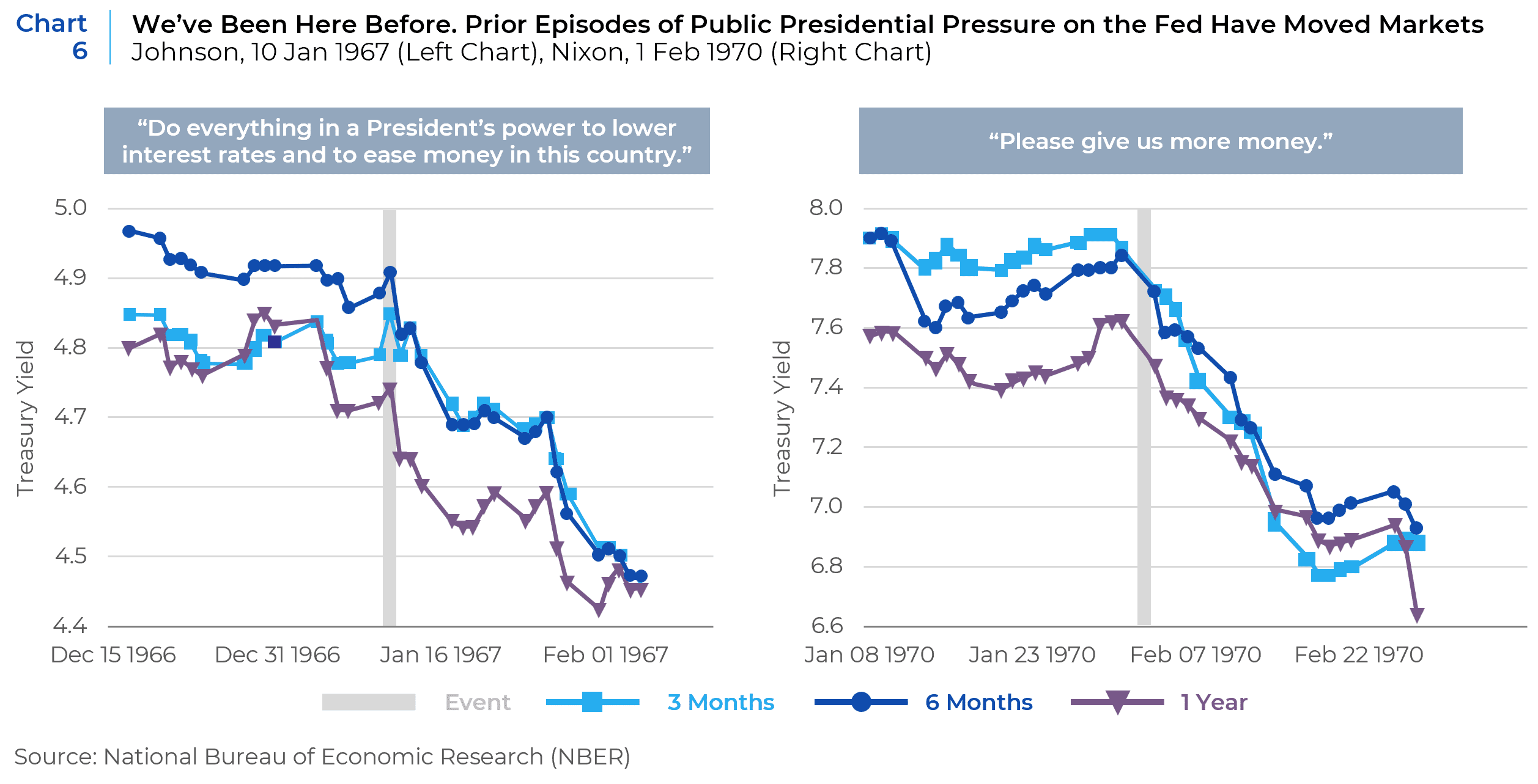 This reaction function of the market echoes both studies above, as well as other data the same NBER published paper added with regard two prior episodes in U.S. history of political pressure on the Fed, by President’s Johnson and Nixon. In these micro case studies, the research observed the change in future nominal Treasury yields with horizons of three months to one year following the public Presidential pressure. Note that in both cases, the largest effects accrued at the longest end of the curve and were persistent beyond the short-term event horizon of the news cycle (see Chart 6).